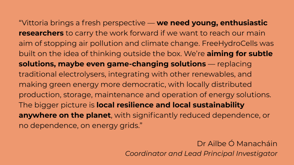 Follow along as we speak to Vittoria Anastasi, a PhD student from the University of Catania, Italy, in collaboration with CNR-IMM, Catania, Italy (a partner in the FreeHydroCells project). During 2025, Vittoria is seconded to the University College Cork (UCC) to complete a specific research collaboration activity as part of the FreeHydroCells Project that will contribute towards the completion of her PhD. Her journey through disciplines — from medicine to chemistry to materials science — reflects both her curiosity and commitment to sustainable innovation.